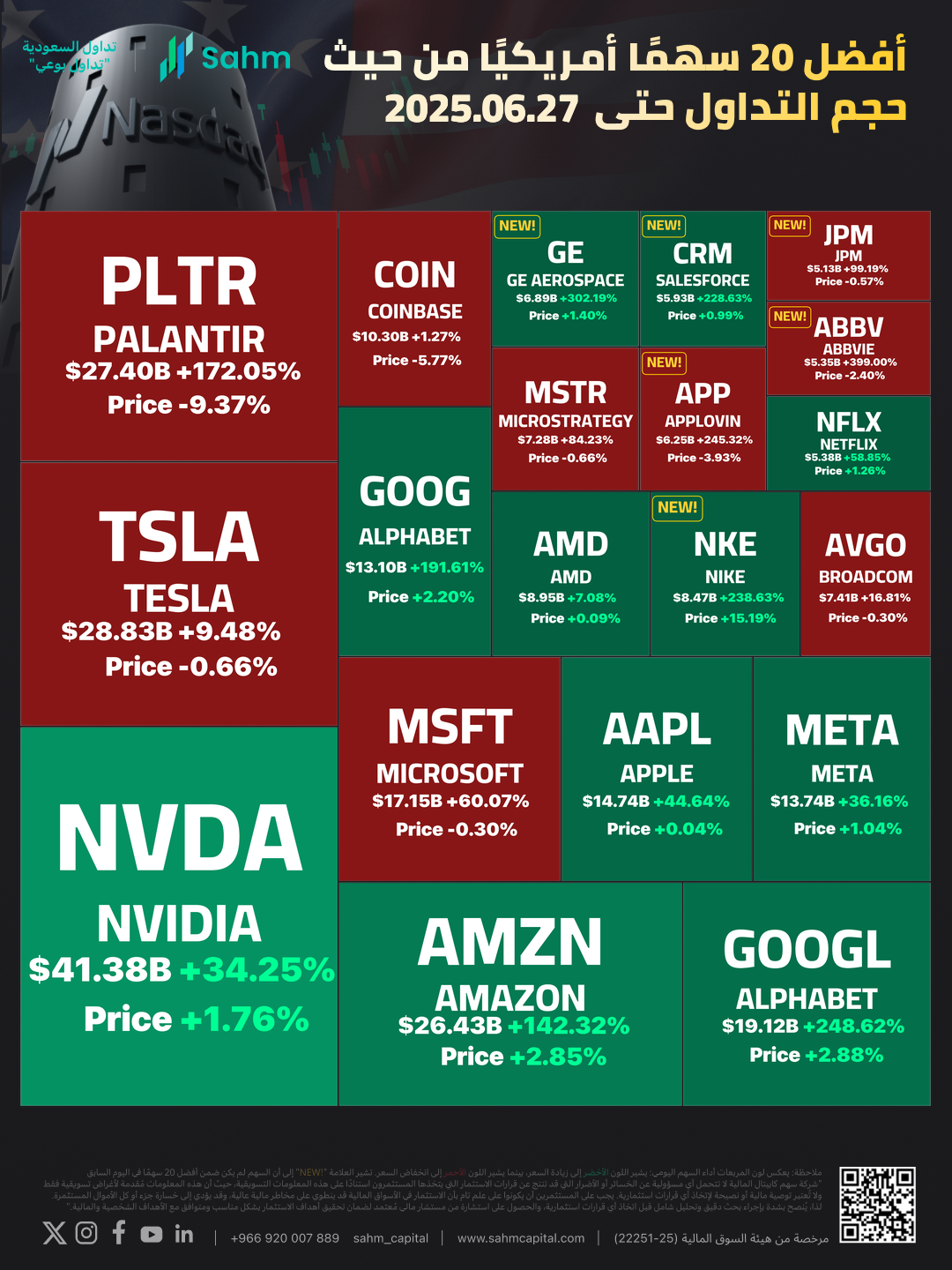 في رسم بياني واحد | ارتفع سهم نايكي بنسبة 15.19% بعد إعلان الأرباح، وانخفض سهم PLTR بنسبة 9.37%؛ وانضمت GE وCRM وNKE وJPM إلى قائمة أكبر 20 سهمًا أمريكيًا من حيث حجم التداول.