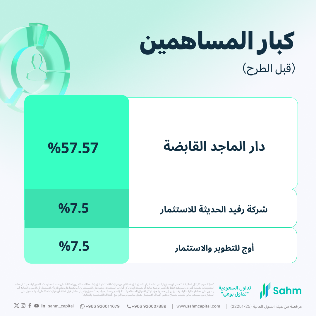 - تبلغ نسبة ملكية السيد خالد بن عبد الرحمن بن ناصر الماجد غير المباشرة 10.60% قبل الطرح، نتيجة لامتلاكه نسبة ملكية تبلغ 16.67% و19.75% في شركة دار الماجد القابضة وشركة المجد الأولى العقارية، والتي بدورها تمتلك 57.75% و4.95% من أسهم المصدر قبل الطرح، على التوالي.