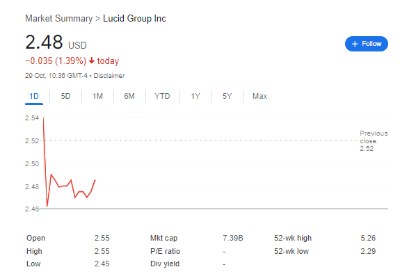 انخفضت أسهم لوسيد موتورز(LCID.US) بنحو 2.4% في وقت ما إلى 2.46 دولار أمريكي في 29 أكتوبر، حيث أعلنت شركة تصنيع السيارات الكهربائية أنها ستبدأ في قبول الطلبات على سيارة Gravity SUV في 7 نوفمبر.