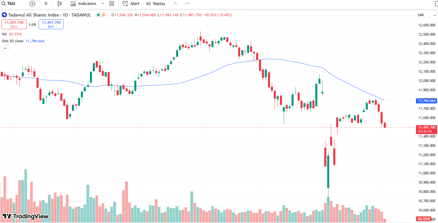استهلت سوق الأسهم السعودية (تداول) تعاملاتها يوم الأحد على انخفاض، حيث شهدت ثلاثة قطاعات رئيسية انخفاضات. وتراجع مؤشر تداول العام(TASI.SA) بنسبة 0.40%، خاسرًا 45.92 نقطة، ليصل إلى 11,497.75 نقطة، بحلول الساعة 11:50 صباحًا بتوقيت الرياض.