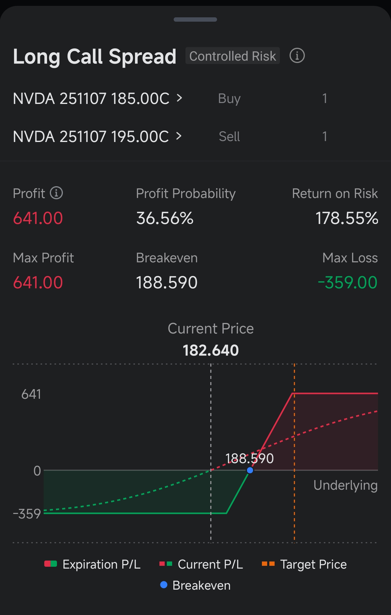 كيفية التنفيذ : بما أن المحفزات تحدث في نهاية أكتوبر، فاختر الخيارات التي تنتهي بعد نوفمبر. في مثالي، استخدمتُ: شراء سهم NVDA 071125 C 185 وبيع سهم NVDA 071125 C 195. اشترِ خيار شراء بسعر مستهدف تتوقع أن يصل إليه سهم NVIDIA، وبِع خيار شراء بسعر إضراب أعلى لإدارة التكاليف والمكاسب المحتملة.