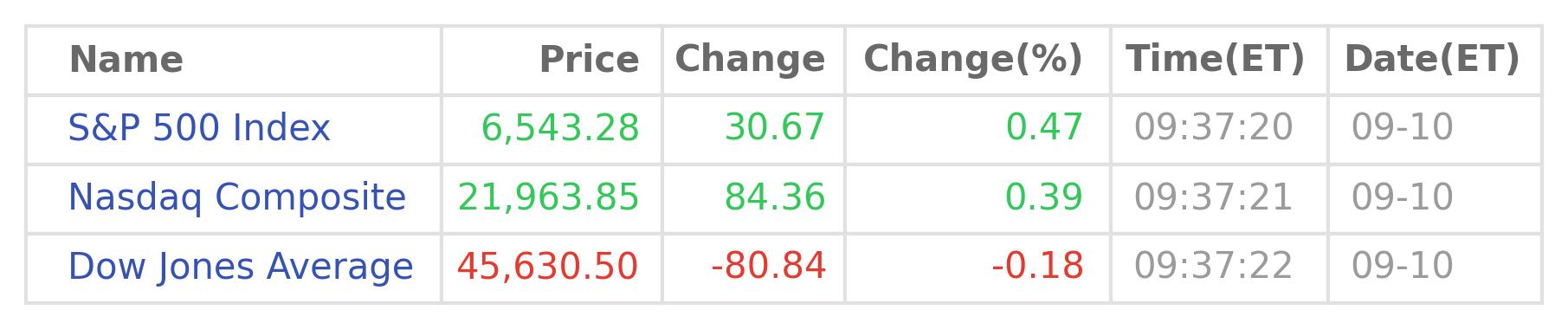 اعتبارًا من الساعة 09:37:20 يوم 10 سبتمبر بالتوقيت الشرقي، ارتفع إس آند بي 500(SPX.US) بمقدار 30.7 نقطة أو 0.47٪ إلى 6543.3، وتقدم مؤشر ناسداك(IXIC.US) الذي يهيمن عليه قطاع التكنولوجيا بمقدار 84.4 نقطة أو 0.39٪ إلى 21963.8، وانخفض داو جونز الصناعي(DJI.US) بمقدار 80.8 نقطة أو 0.18٪ إلى 45630.5.
