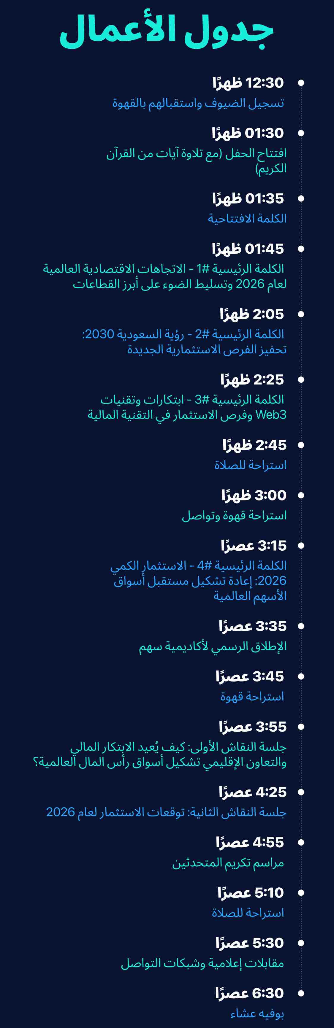 وقال محمد العسيري، الرئيس التنفيذي للمالية في شركة سهم كابيتال: "نلتزم بمرافقة مستخدمينا في رحلتهم نحو النجاح المالي من خلال مساعدتهم على تنمية ثرواتهم وتوسيع فرصهم. ومن خلال جمع نخبة من الخبراء العالميين في الرياض، نوفّر مساحة تمكّن المستثمرين من الوصول إلى رؤى قيّمة لعام 2026 والتفاعل مباشرة مع التوجّهات التي تشكّل بيئة السوق في العام المقبل."