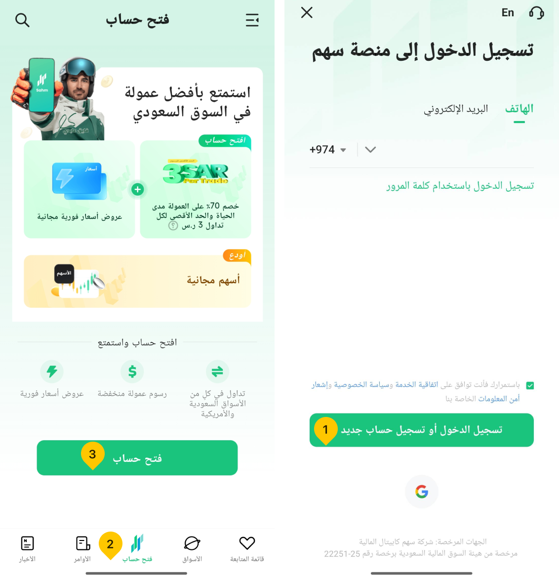 تدعم منصة سهم حاليًا فتح الحسابات للمواطنين والمقيمين في السعودية والإمارات وقطر. وللبدء، يُرجى اتباع الخطوات التالية: