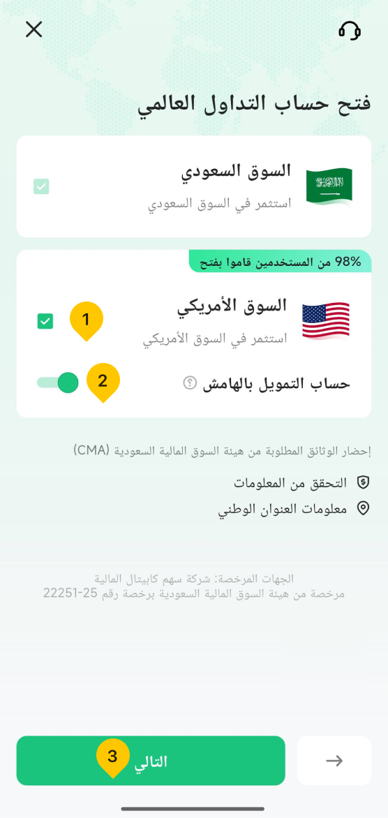 الخطوة 2: اختر نوع الحساب الذي تريد فتحه. سواء حساب الأوراق المالية السعودية أو الأمريكية أو كلاهما. كما يمكنك تحديد ما إذا كنت ترغب في فتح حساب الهامش أيضًا، ثم انقر على التالي للمتابعة.