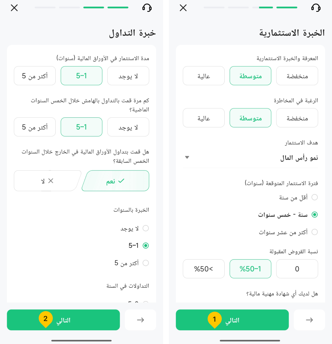 الخطوة 4: أجب عن الأسئلة المتعلقة بخبرتك في التداول، حيث سيساعد ذلك على تقديم خدمات استثمارية مخصصة لتلبية احتياجاتك وأهدافك.