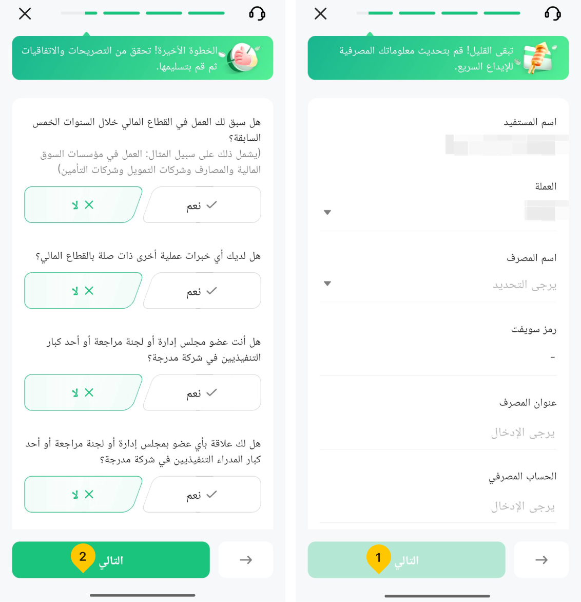 الخطوة 7: املأ معلوماتك المصرفية، ثم أجب على أسئلة التحقق من خبراتك المالية وانقر على "التالي".