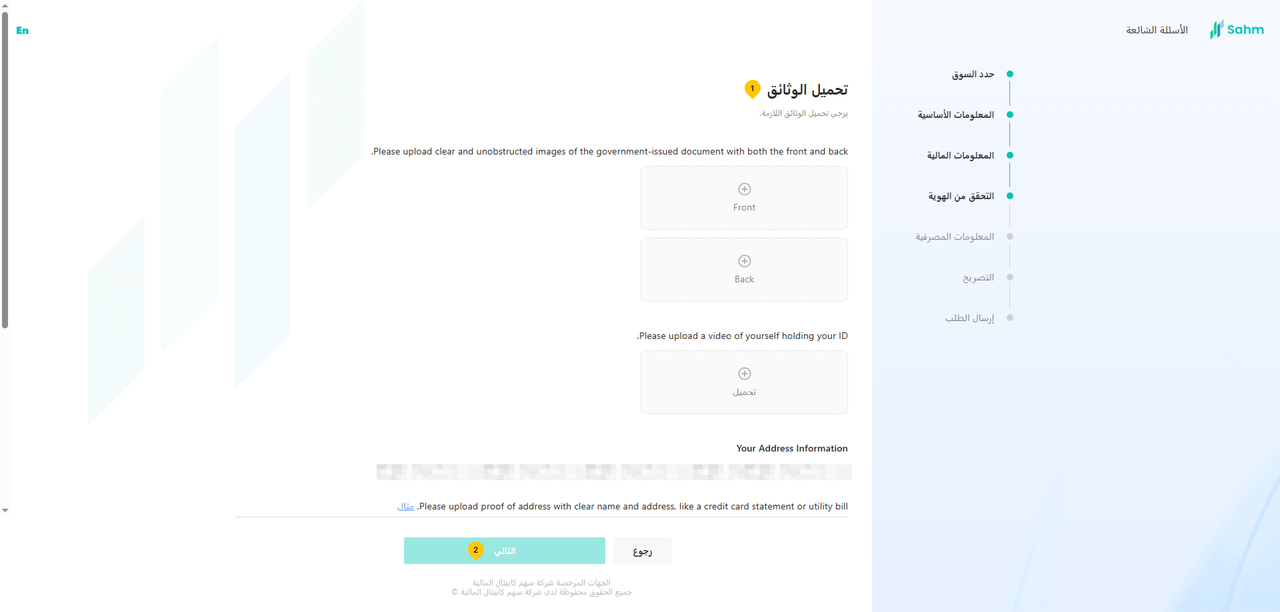 9. قم بتحميل الوثائق المطلوبة، ثم انقر على"التالي".