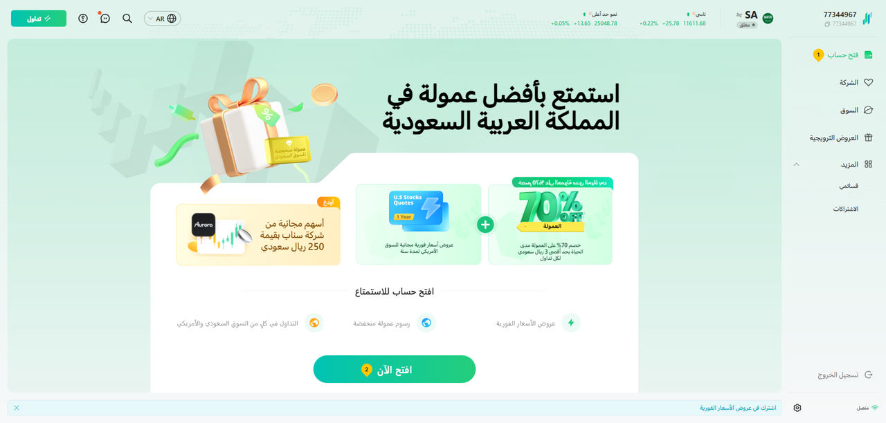 1. قم بتسجيل الدخول إلى حسابك في منصة سهم وانتقل إلى قسم "فتح حساب" الموجود في الجزء العلوي من الصفحة. ثم انقر على "افتح الآن" لبدء عملية فتح الحساب.