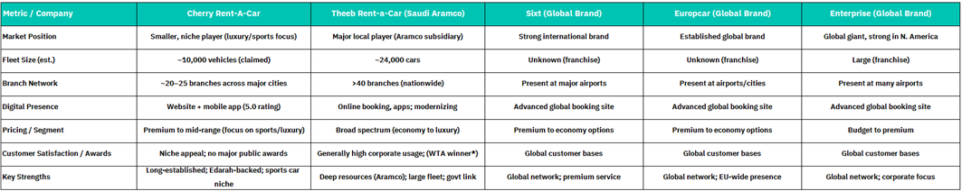 Strengths: Cherry has a long track record (over 40 years) as one of Saudi Arabia’s first car rental companies. It enjoys strong parentage (Saudi Edarah Holding) and a diversified model (rentals + sales). Its brand is known for quality and a luxury/sports focus. The upcoming IPO could provide capital for growth. Its 2024 profit margin (~14%) was solid, reflecting operational efficiency.