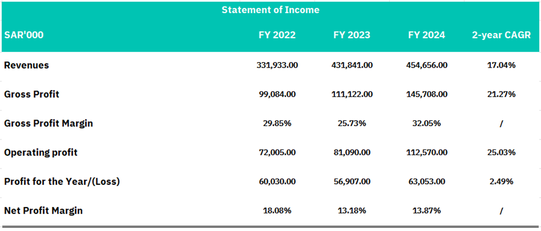 Cherry Car Rentals demonstrated robust top-line growth and significant margin expansion over the two years from FY2022 to FY2024. Revenues increased at a 17.04% CAGR, growing from SAR 331.9 million to SAR 454.7 million, reflecting strong demand and successful market penetration. More impressively, Gross Profit expanded at a 21.27% CAGR, outpacing revenue growth and expanding from SAR 99.1 million to SAR 145.7 million. This disproportionate growth in gross profit was accompanied by a 210-basis-point improvement in Gross Profit Margin, from 29.85% in FY2022 to 32.05% in FY2024, indicating enhanced operational efficiency and improved cost management. Operating Profit showed the most robust performance, growing at a 25.03% CAGR to reach SAR 112.6 million, demonstrating the company's ability to leverage its growing scale while maintaining disciplined expense control.