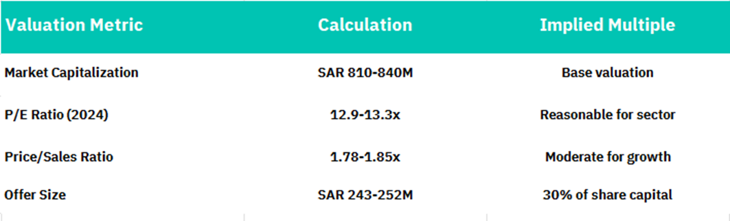 The company has established an IPO price range of SAR 27-28 per share, implying a total equity valuation range of approximately SAR 810-840 million for the entire company ($216-224 million). This valuation reflects the following key metrics: