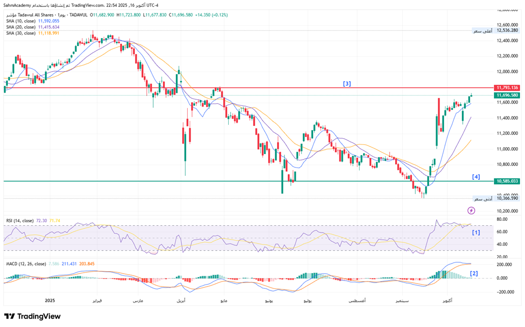 [3] From a technical perspective, the index has successfully reclaimed the September highs and is testing resistance near the 11,793 level, with the daily close of 11,696.58 positioning it just below this key threshold.