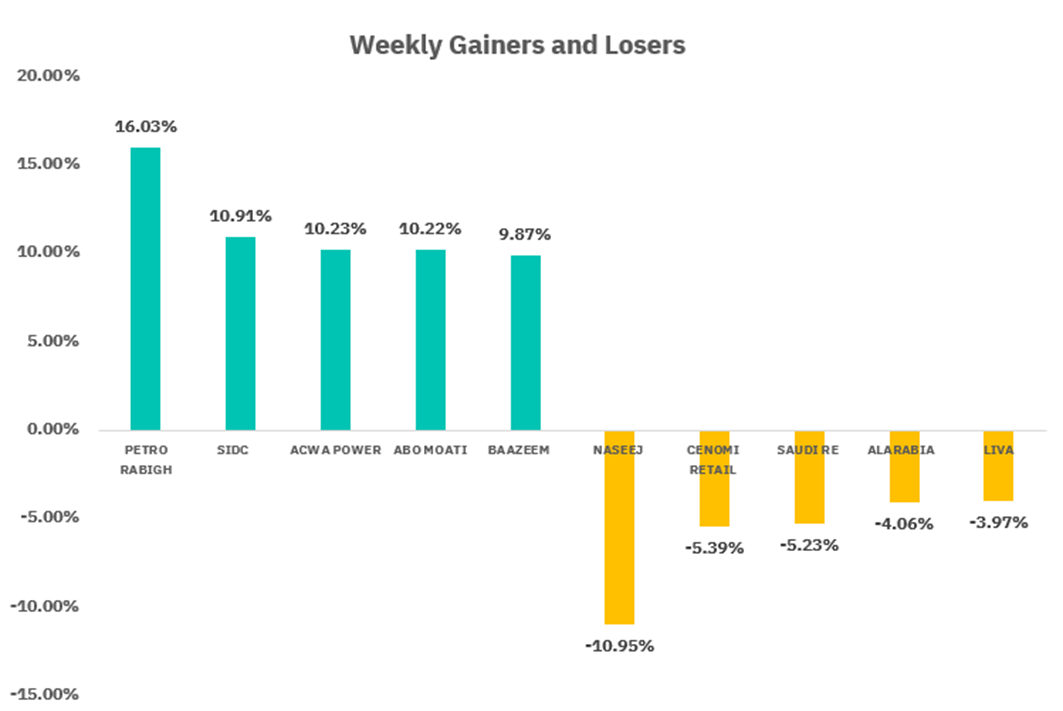 From the perspective of individual stock performance, 154 companies saw their stock prices rise this week, while 111 companies saw their stock prices fall. The companies with the highest increase included PETRO RABIGH, SIDC, ACWA POWER, with increases of 16.03%, 10.91%, and 10.23% respectively. The companies with the highest decline included NASEEJ, CENOMI RETAIL, SAUDI RE with declines of 10.95%, 5.39%, and 5.23% respectively.