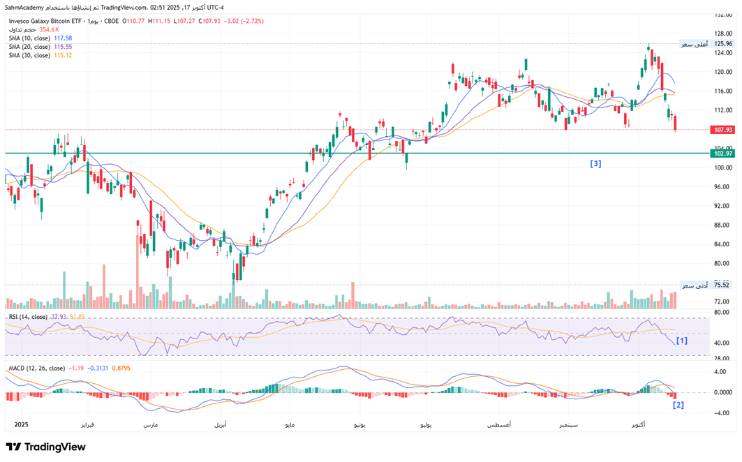 BTCO is currently trading at 107.93, having declined from an intraday high of 111.15 and a recent peak of 125.96 in September. The ETF has experienced significant volatility throughout 2025, rising approximately 42% from the January lows near 76 to the September highs, but subsequently retracing roughly 14% from those peaks, indicating profit-taking and consolidation in the cryptocurrency space. The simple moving average configuration shows the 10-day at 117.58, 20-day at 115.55, and 30-day at 115.12, all trading meaningfully above current price, signaling a deterioration in short-term uptrend structure and suggesting the asset has fallen below key support levels.