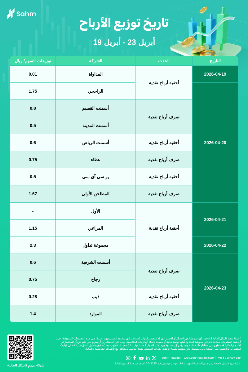 Cash dividends will be distributed by: Qassim Cement, Madinah Cement, Ata’a, First Mills, Eastern Cement, Glass, and Resources.