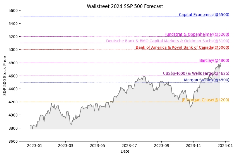 The average target stands optimistically at 4827.5 points, hinting at stability or growth, with giants like Goldman Sachs Group, Inc.(GS.US) , Deutsche Bank AG(DB.US) , Bank of America Corporation(BAC.US), Royal Bank of Canada(RY.US) and Bank of Montreal(BMO.US)'s subsidiary BMO Capital among those predicting an upbeat 2024 for US equities.