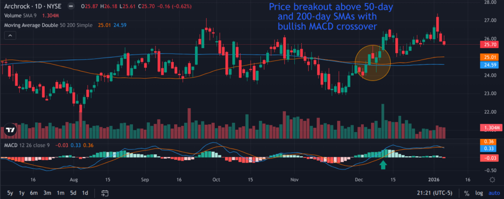 A breakout could be underway for AROC shares, driven by a series of 2025 analyst upgrades (currently a 4.5 Strong Buy rating based on 10 analyst reports) and a few promising technical signals. The stock had been stuck in a tight range for most of the second half of 2025, but broke above the 50-day and 200-day SMAs in December with a matching bullish MACD crossover. Despite a slight revenue decline in Q3 2025 (its first quarterly drop in over three years), AROC is well-positioned to benefit from increased energy demand from AI data centers this year.