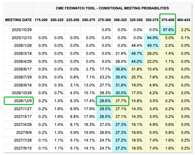 Let's start with the data: According to the CME FedWatch tool, traders currently assign a 97.8% probability to a 25 basis point rate cut this week, with only a 2.2% chance of no cut. Economists point out that the key premise for rate cuts is that the Fed believes the current 4%-4.25% benchmark rate is already elevated and is substantially dragging down the U.S. economy.