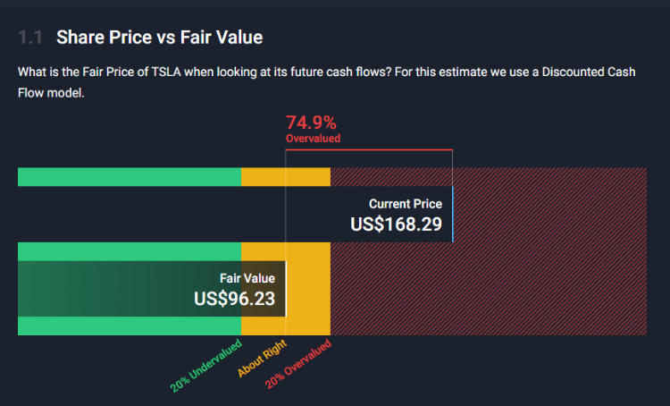 Old-fashioned Wall Street seems unconvinced about Tesla's prospects, with the stock price derived from cash flow analysis significantly higher than its fair value discounted from expected cash flows.