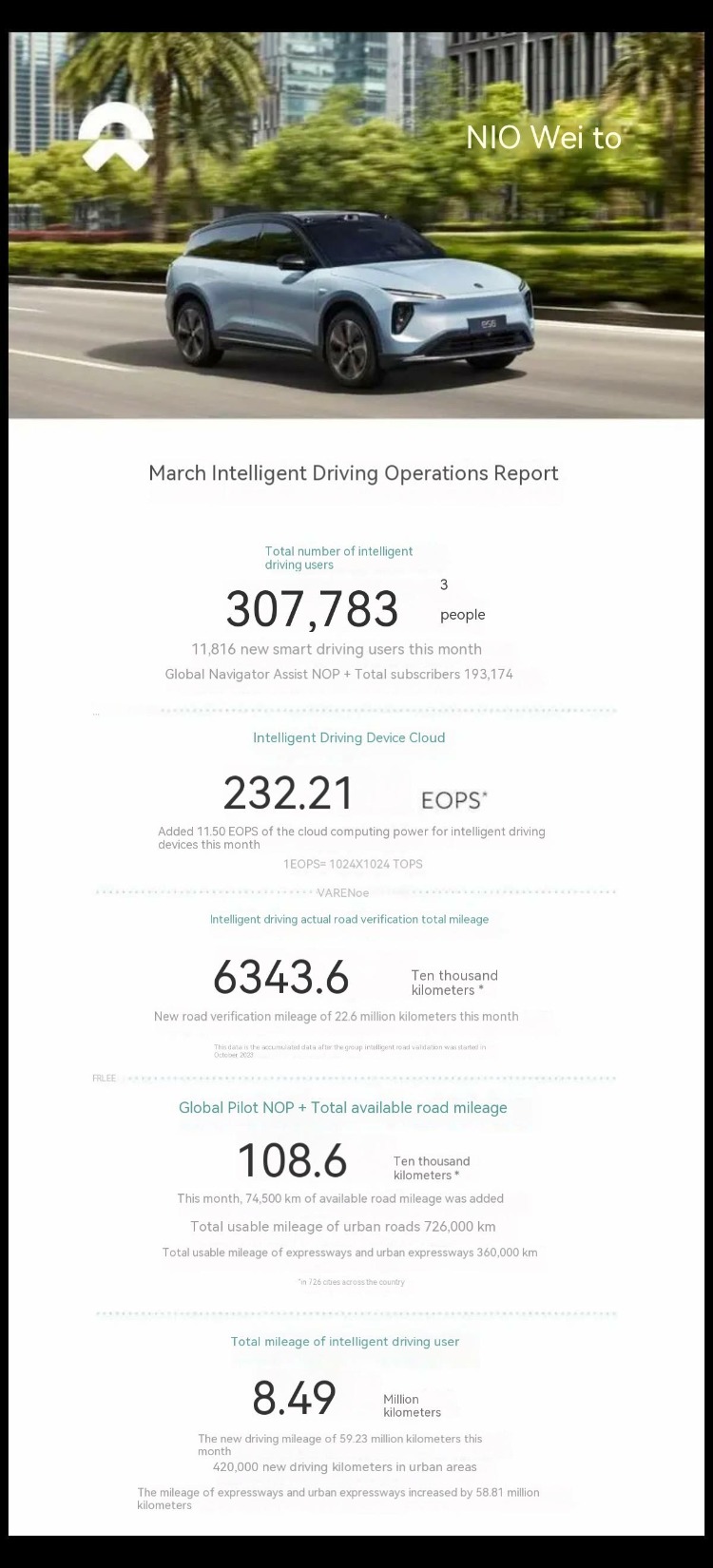 As of March 2024, NIO(NIO.US) had cumulatively sold 482,736 new energy vehicles in the Chinese market, with a total of 307,783 smart driving users that month, of which 193,174 were users of the full-domain navigation assistance NOP+, representing a penetration rate of nearly 40%.