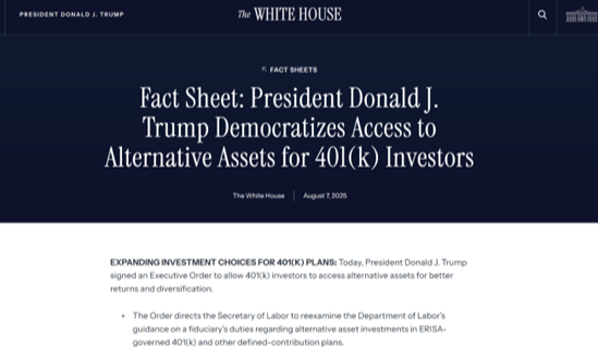 The summary of the executive order released by the White House stated: "The Securities and Exchange Commission (SEC) must consider pathways to facilitate access to alternative asset investments for participants in defined-contribution retirement plans."