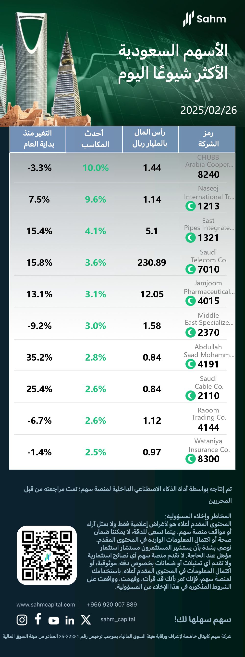 At the close of 26/02/2025, the Tadawul All Shares Index dropped by 0.56%, closing at 12232.65 points; the Parallel Market Capped Index rose by 0.04%, closing at 31286.23 points. Sahm has compiled the Top 10 Daily Stock Price Gainers in the KSA market.