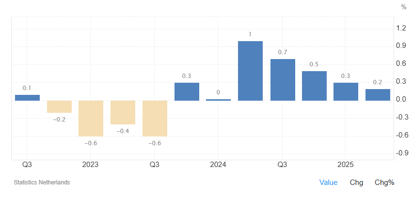 Public frustration in the Netherlands has increased as the country's gross domestic product (GDP) has declined for its fourth consecutive quarter. GDP grew by just 0.2% quarter-on-quarter in Q2, slowing from 0.3% in Q1, according to data from Trading Economics.