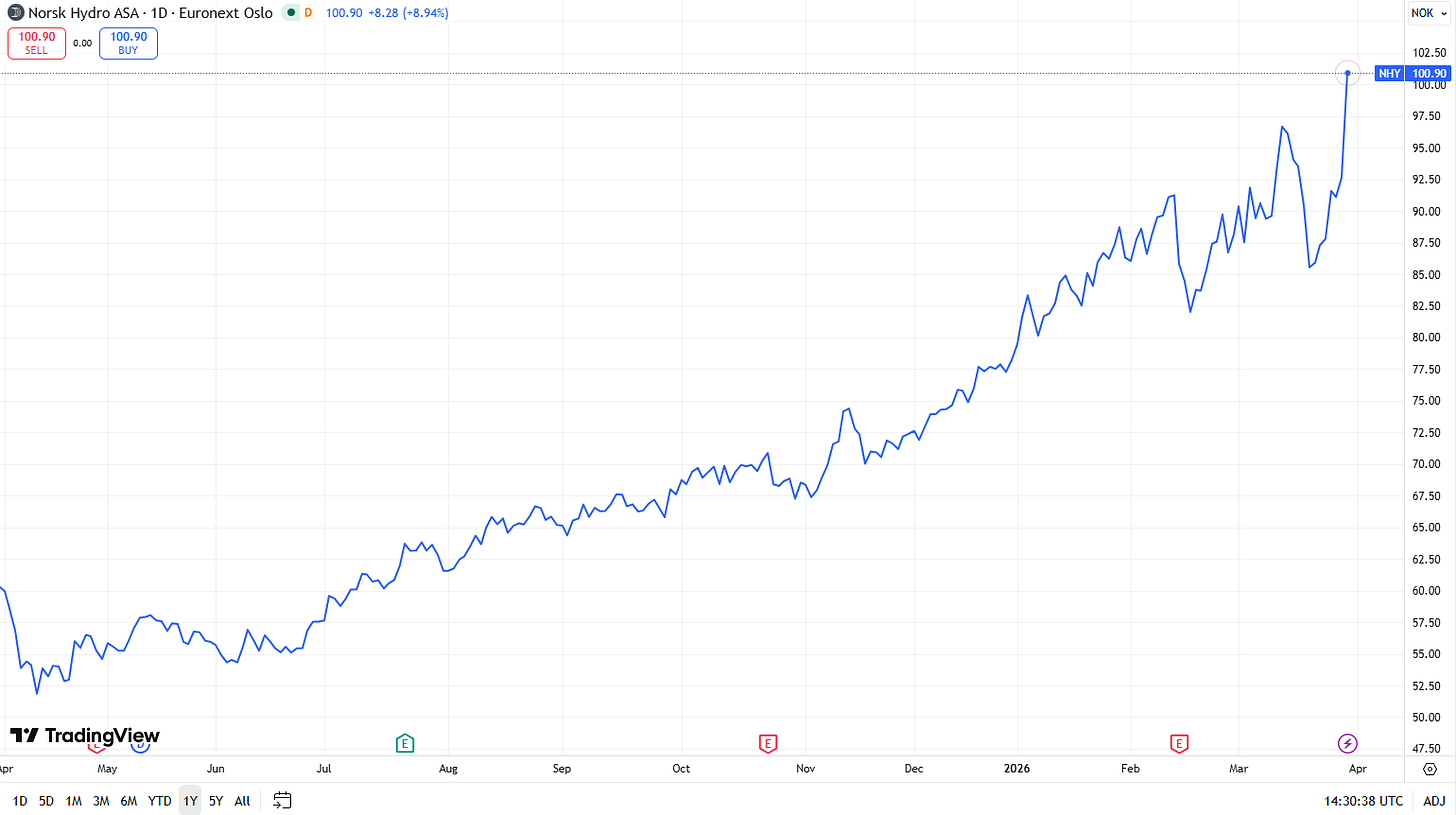 Norsk Hydro (NHY.OL) traded sharply higher on Monday, reflecting the aluminum‑shortage theme. The stock rose more than 9.3% today and is up 29% year-to-date. The share price reached a 52-week high, as investors factor in higher aluminum prices and the Middle East-driven supply squeeze.