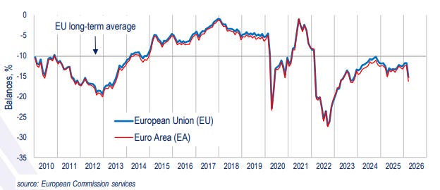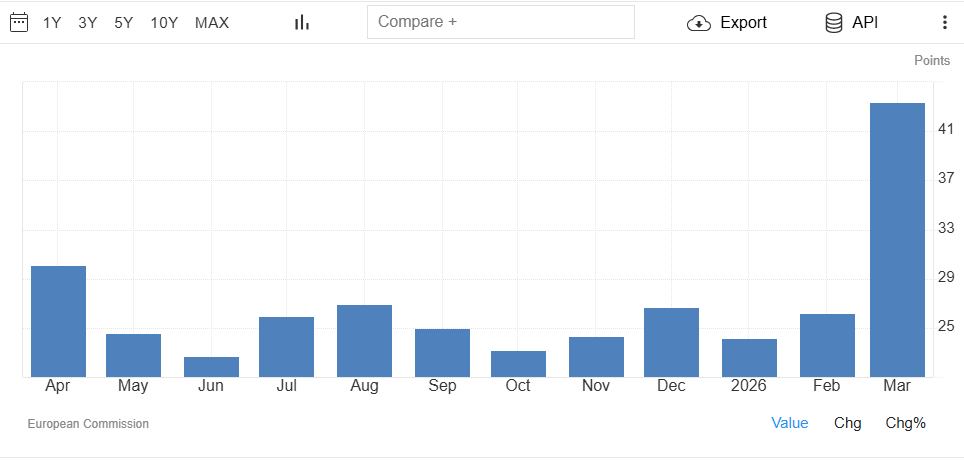 Why it matters: The drop in the Economic Sentiment Indicator shows that overall business and consumer confidence in Europe's near‑term outlook has weakened. The reading is still technically above the very low levels seen during the pandemic or energy‑crisis troughs. It is another example of how the Middle East conflict is feeding into Europe's outlook. The sharp rise in the consumer price trend signals a significant deterioration in what households think will happen to prices ahead.