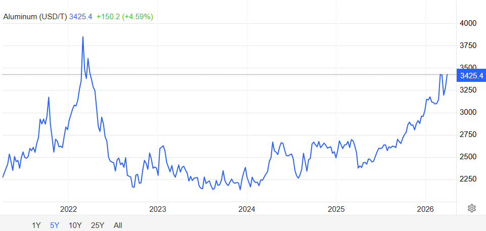The Middle East accounts for approximately 9% of the global metal output, used in airplanes, food packaging, and solar panels, Bloomberg reported on Monday. Aluminum futures in the UK jumped more than 3.9% to $3,403/ton, hovering near their highest level in four years. A sustained price spike would heap further pressure on manufacturers already reeling from the surge in energy costs.