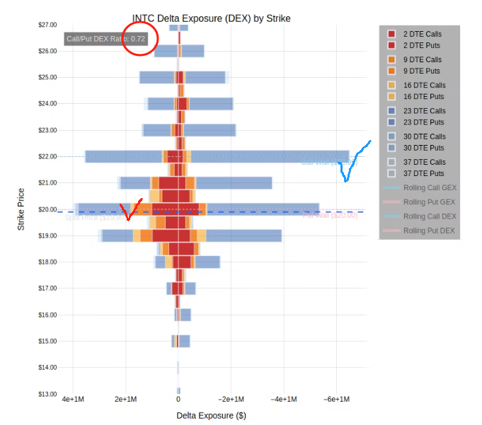 - Watch the $20 Level: Options data (specifically GEX - Gamma Exposure) highlights $20 as a critical level. If INTC drops below $20, things could get shaky and volatility might increase (market makers might amplify selling). Above $21, the market might find more stability. Signal: Keep a close eye on the $20 mark as potential support; a break below could signal further weakness for the stock.