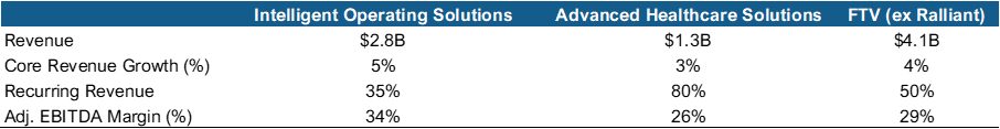 Advanced Healthcare Solutions (AHS). The AHS segment supplies critical workflow solutions critical for patient care. This includes instrument sterilization solutions, instrument tracking, biomedical test tools, radiation detection and safety monitoring, and end-to-end clinical productivity software and solutions. The AHS segment has a recurring revenue base at nearly 80% with adjusted EBITDA margins in high 20s. The addressable market across AHS verticals exceeds $10 billion, with low single-digit to mid-single digit growth potential.
