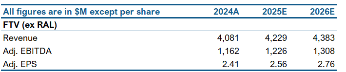 We expect FTV (ex RAL) to deliver revenue growth of 3.6% in FY25. We expect margins to expand, supported by higher mix of recurring revenue and operating leverage. As such, we model EBITDA margins of 29% in FY25, up 50 bps YOY. The combination of solid revenue growth and margin expansion should drive EPS higher. We model adjusted EPS of $2.56 in FY25, up 6% YOY.