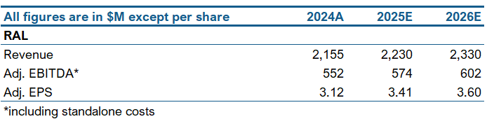 We expect RAL to deliver revenue growth of 3.5% in FY25 and 4.0% in FY:26. We expect adjusted EBITDA to grow faster than revenue, implying margin expansion. As such, we model EBITDA margins of 23.7% in FY25 and 23.9% in FY:26. We forecast adjusted EPS of $3.40 in FY25 and $3.60 in FY26.