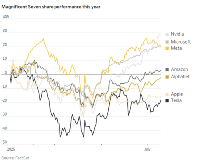 Nvidia, Meta, and Microsoft have each risen by about 20% or more this year. And despite negative impacts from Trump's tariffs, Amazon still holds gains;