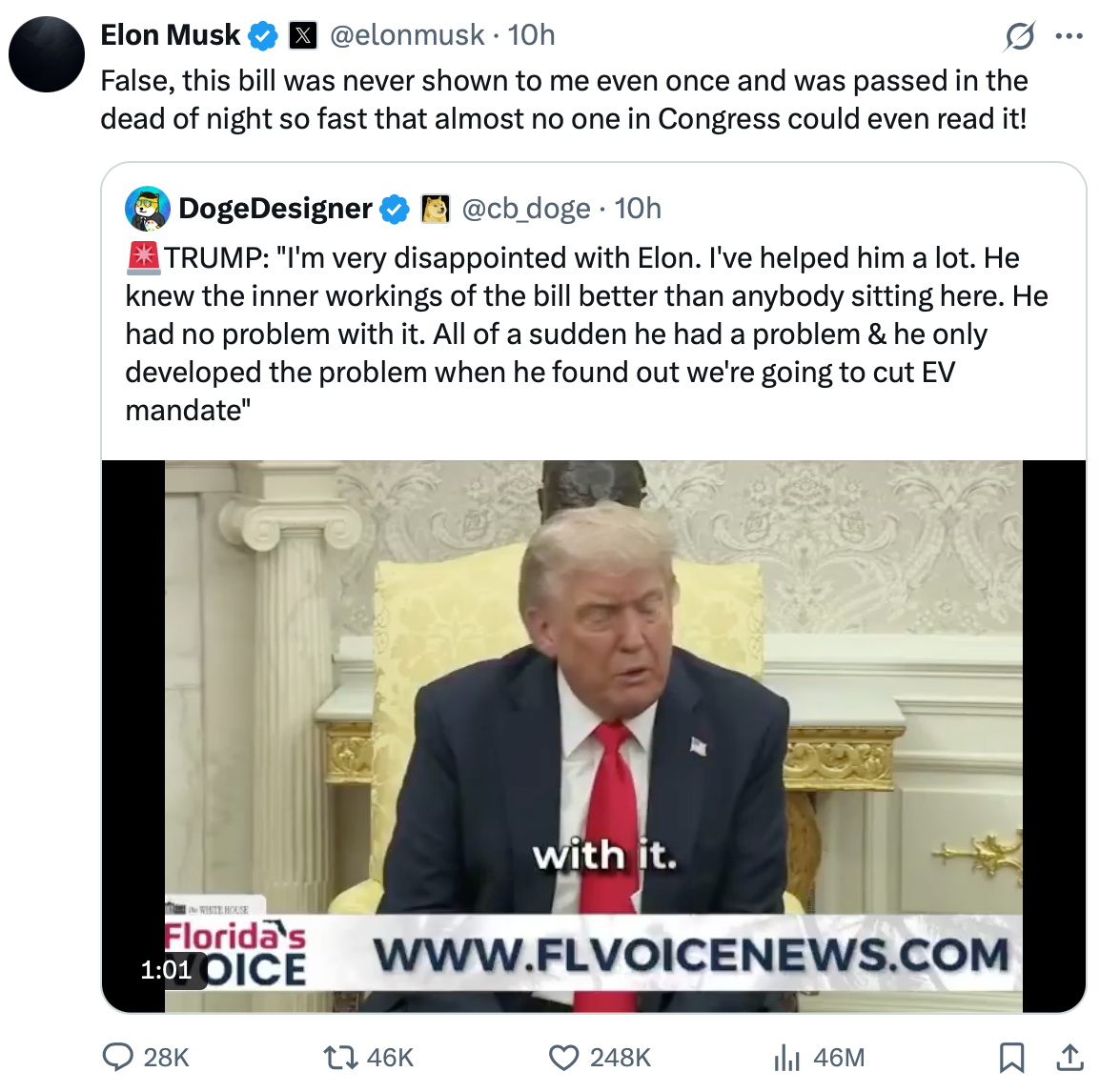- The Lead-Up: Musk, who recently left his role in a "government efficiency" department, had been criticizing Trump's "big and beautiful" tax bill for days, calling it fiscally irresponsible.