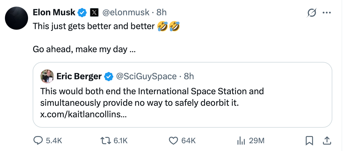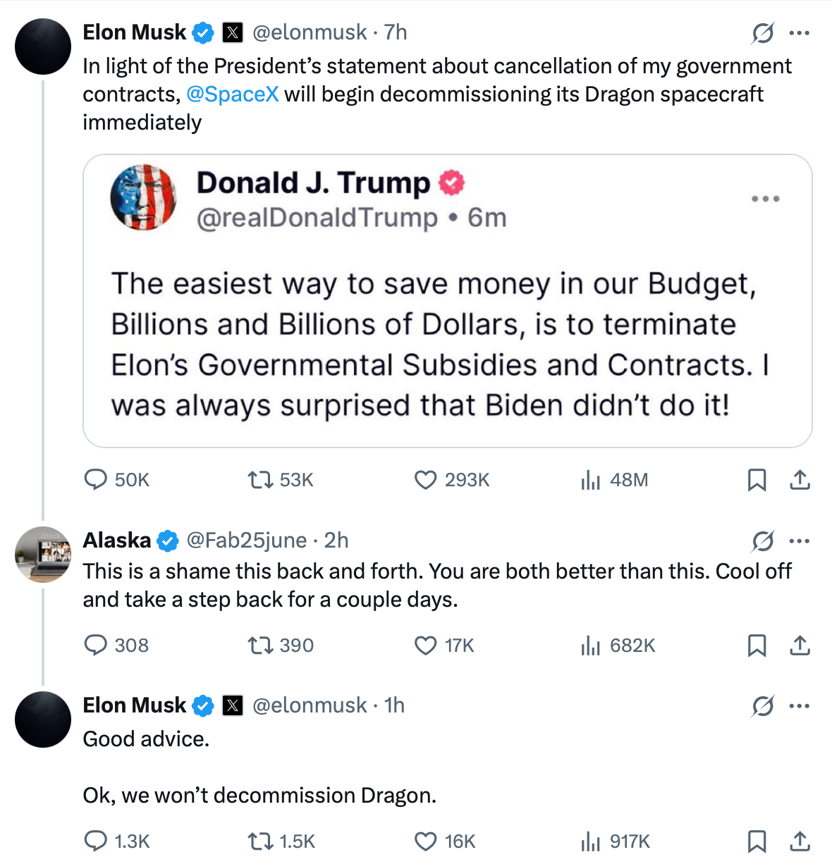 - He announces SpaceX will "immediately begin decommissioning its Dragon capsules" in response to Trump's threats. However, in the latest developments, Musk seems to be taking the advice of "Cool off and take a step back for a couple days."