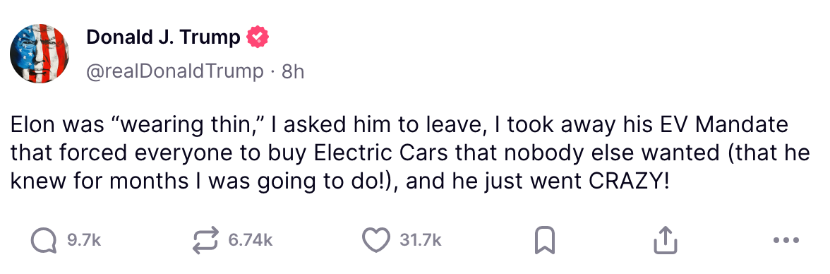 - Thursday Morning: In an interview, Trump says he's "very disappointed" in Musk and hints their once-good relationship is over. He claims Musk knew the EV subsidy cuts were coming.