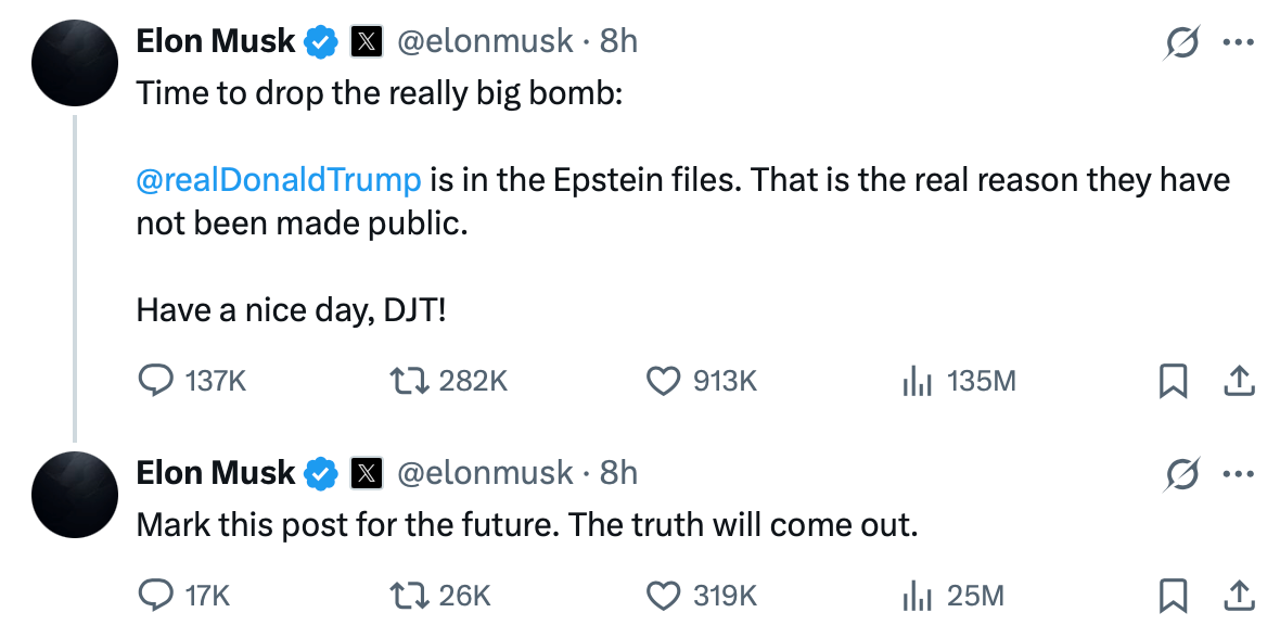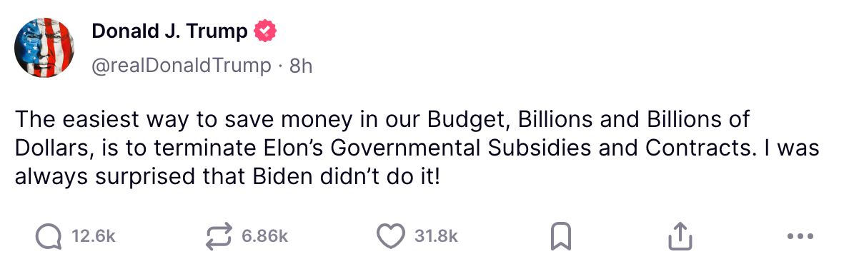 - Afternoon Escalation: Trump posts on Truth Social, "I asked him to leave... he just went crazy!" He then makes a massive threat: "The easiest way to save billions of dollars in our budget is to terminate Elon's government subsidies and contracts."