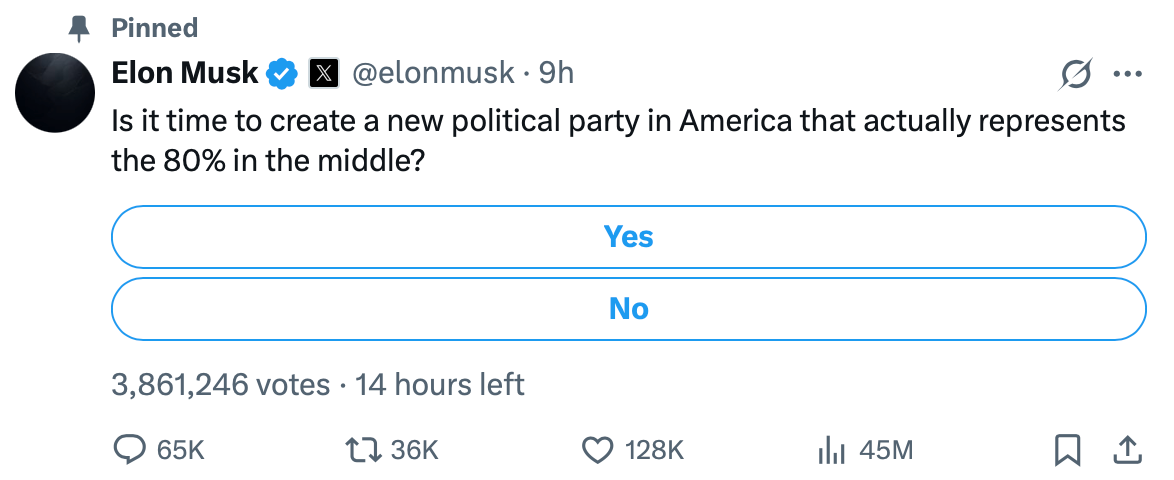 - The New Party: Musk polled his followers on creating a new political party for the "80% in the middle." Over 80% of the 3.8 million voters said yes. Will he pursue this?