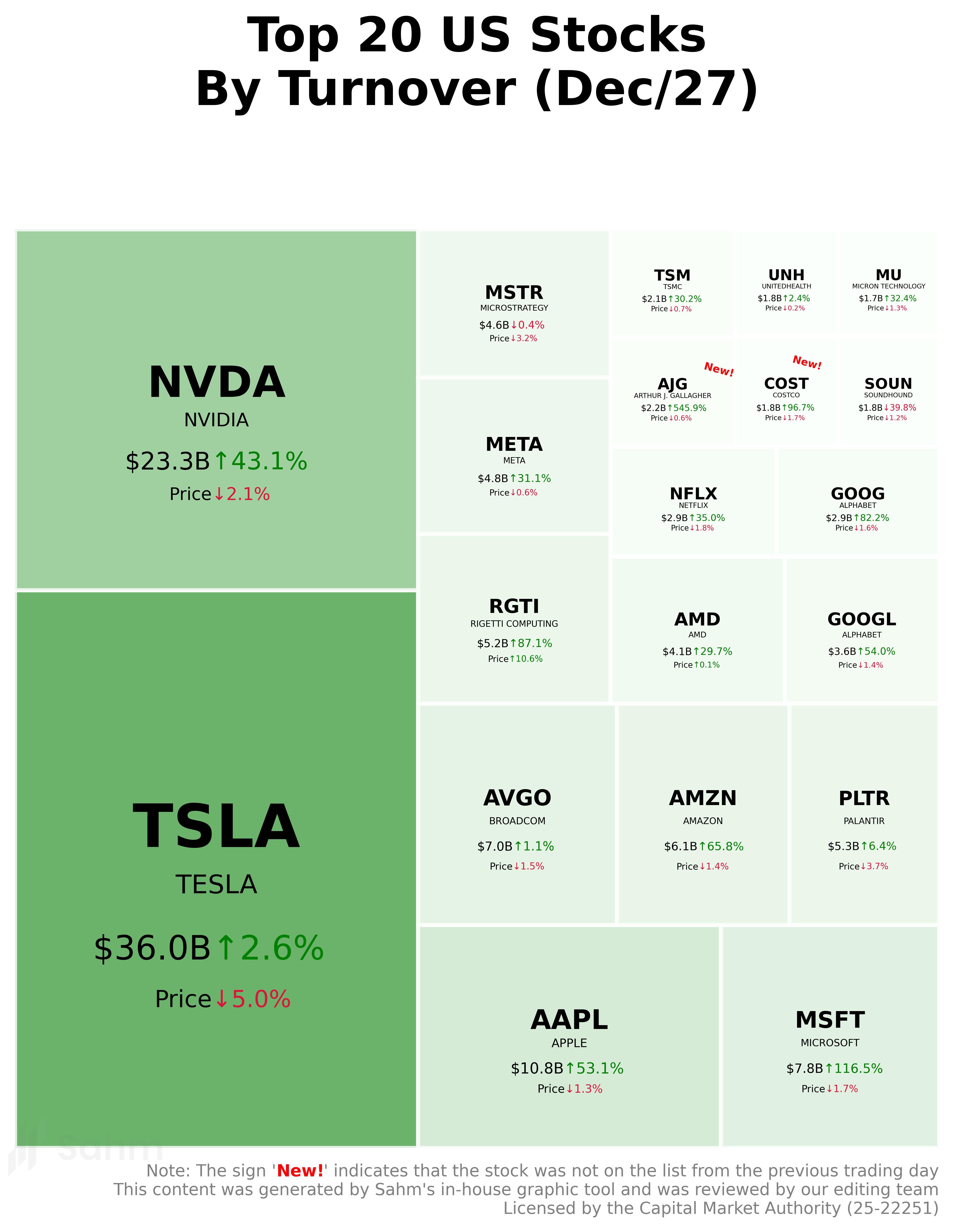 In One Chart | TSLA Down 5%, Turnover Little Changed; COST, AJG Joined Top 20 US Stocks by Turnover on Dec/27