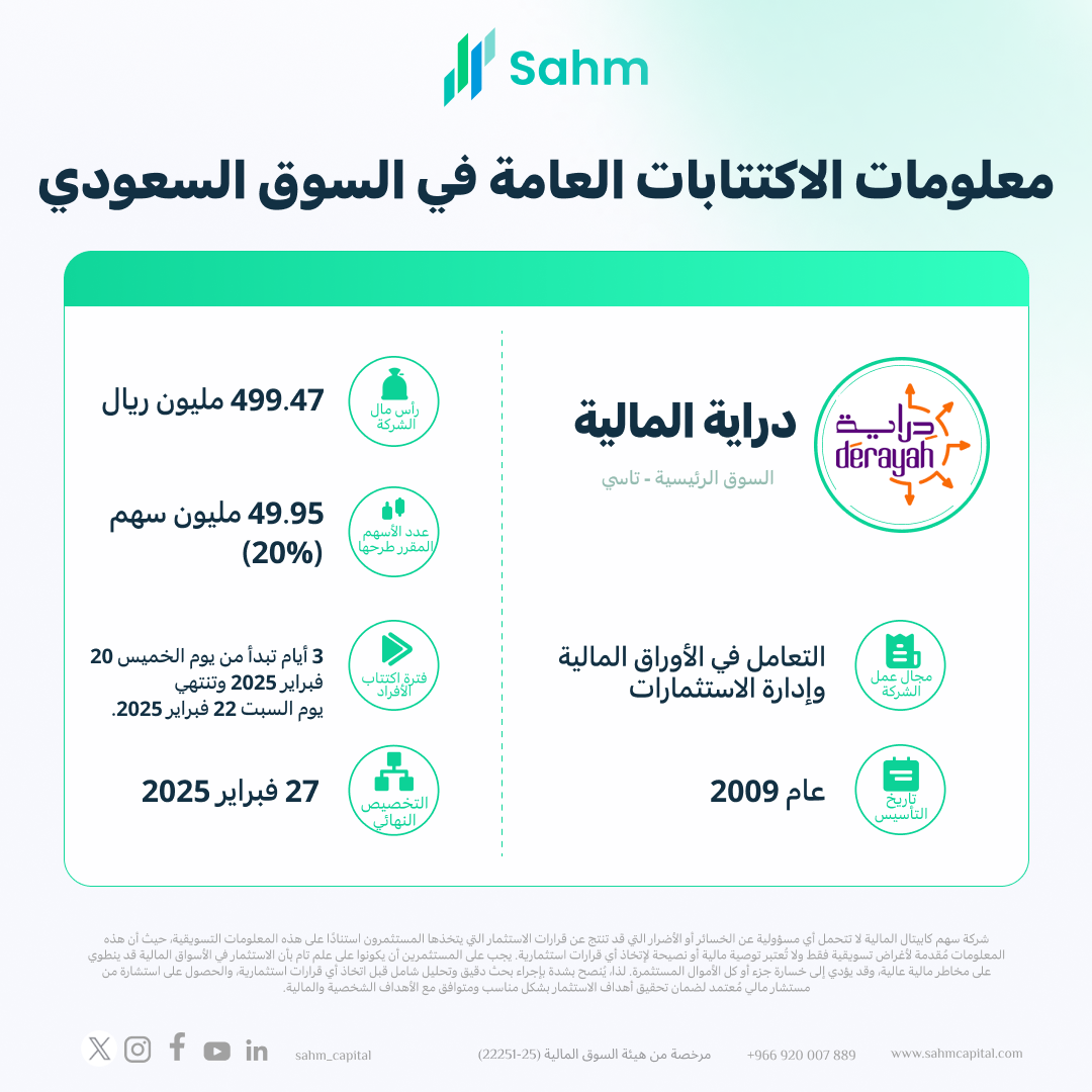 Riyadh, 20 February 2025 – The retail subscription phase for Derayah Financial Company’s initial public offering (IPO) officially begins today. Eligible Individual investors can now participate in the offering on Sahm Platform, which Derayah is set to list on the Saudi Exchange (Tadawul)'s Main market.