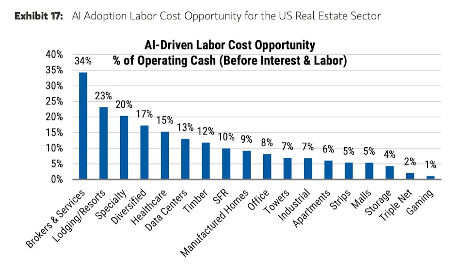 In the real estate sector, 32% of Real Estate Investment Trusts (REITs) currently have significantly more exposure to AI technology than during the January survey. Ron Kamdem, Head of US REIT and Commercial Real Estate Research at Morgan Stanley, stated that roughly 37% of tasks across the 525,000 positions in the public REIT and commercial real estate services industry could be automated.
