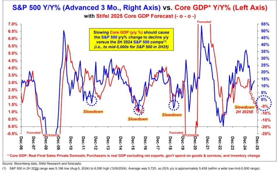 In a report to clients this month, Bannister shared the chart below, illustrating the relationship between core GDP and S&P 500 returns. The current trend suggests negative annualized returns for the S&P 500 in the coming months.