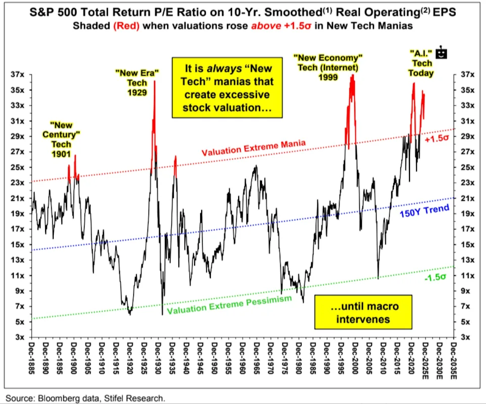 As the chart shows, this metric is currently at levels indicating "extreme valuation exuberance," comparable to peaks seen in 2021, 2000, and 1929, sitting 1.5 standard deviations above its 10-year trend. This suggests investors may be overly optimistic about AI by historical standards.