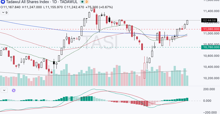 The Saudi Arabian benchmark index Tadawul All Shares Index(TASI.SA) traded higher during the early session on Tuesday, recording a gain of 0.67%. The upward movement was supported by positive performance in key heavyweights, with Al Rajhi Bank(1120.SA) advancing 1.2% and Saudi Arabian Mining Co.(1211.SA) rising 1.6%. Additionally, shares of energy major Saudi Arabian Oil Co.(2222.SA) contributed to the gains, adding 0.2%.