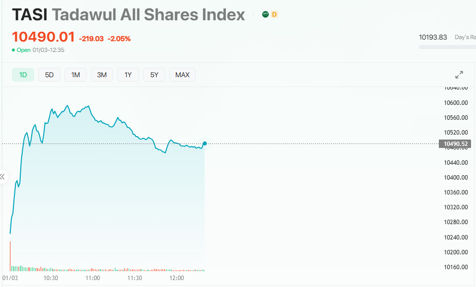 Saudi Arabia's benchmark Tadawul All Shares Index(TASI.SA) pared early losses exceeding 400 points to trade down about 2% (219 points) at 10,490 after more than two hours of trading on March 1, with turnover reaching SAR 3.3 billion.