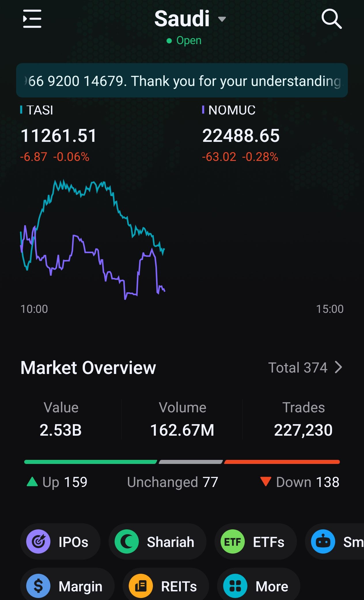 Saudi Arabia's stock market remained unchanged on Sunday. As of press time, the Tadawul All Shares Index(TASI.SA) slipped by 0.06%, while the Parallel Market Capped Index (NomuC)(NOMUC.SA) dropped by 0.28%.