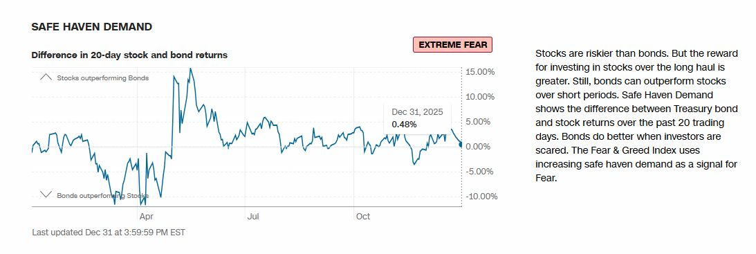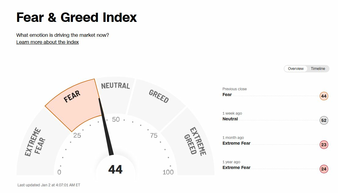 The main "Fear & Greed Index" sits at 44, squarely in the "Fear" zone. This is a shift from just a week ago (52, "Neutral") and suggests a cautious start to the new year, even though we just finished a strong 2025.